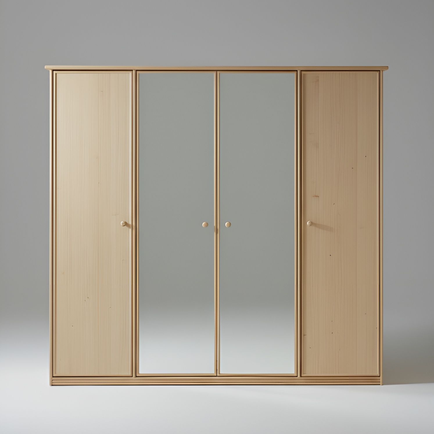 Armoire penderie 4 portes — 2 portes frêne + 2 miroirs — 3 tiroirs — penderie centrale — 5 étagères amovibles — coloris au choix — fabrication espagnole