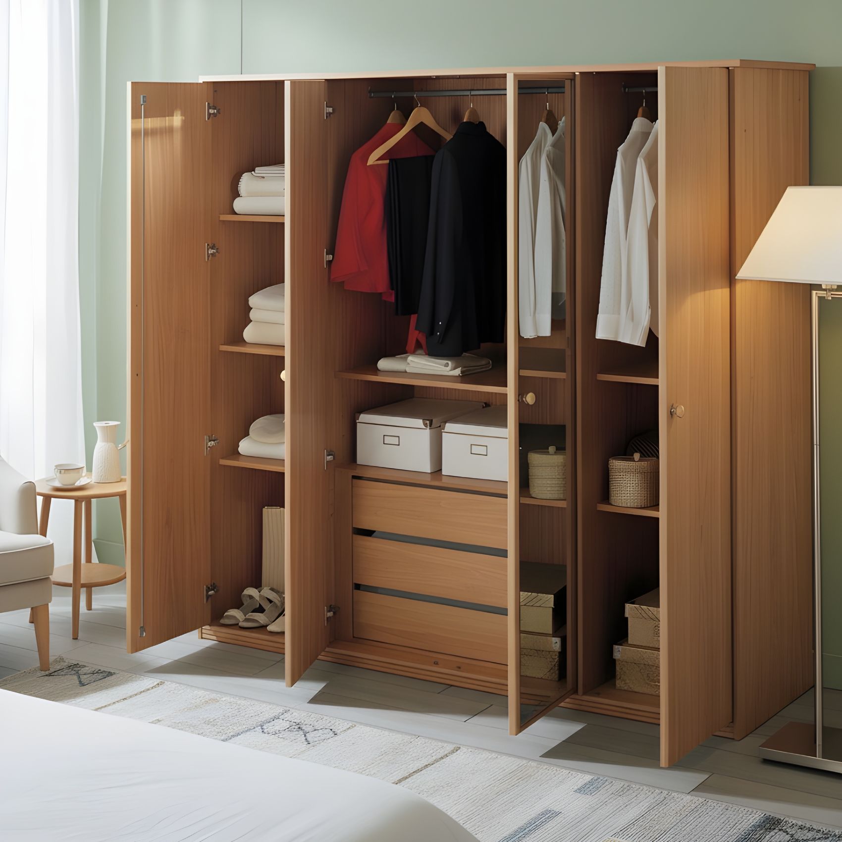 Armoire 4 portes avec penderie tiroirs et étagères