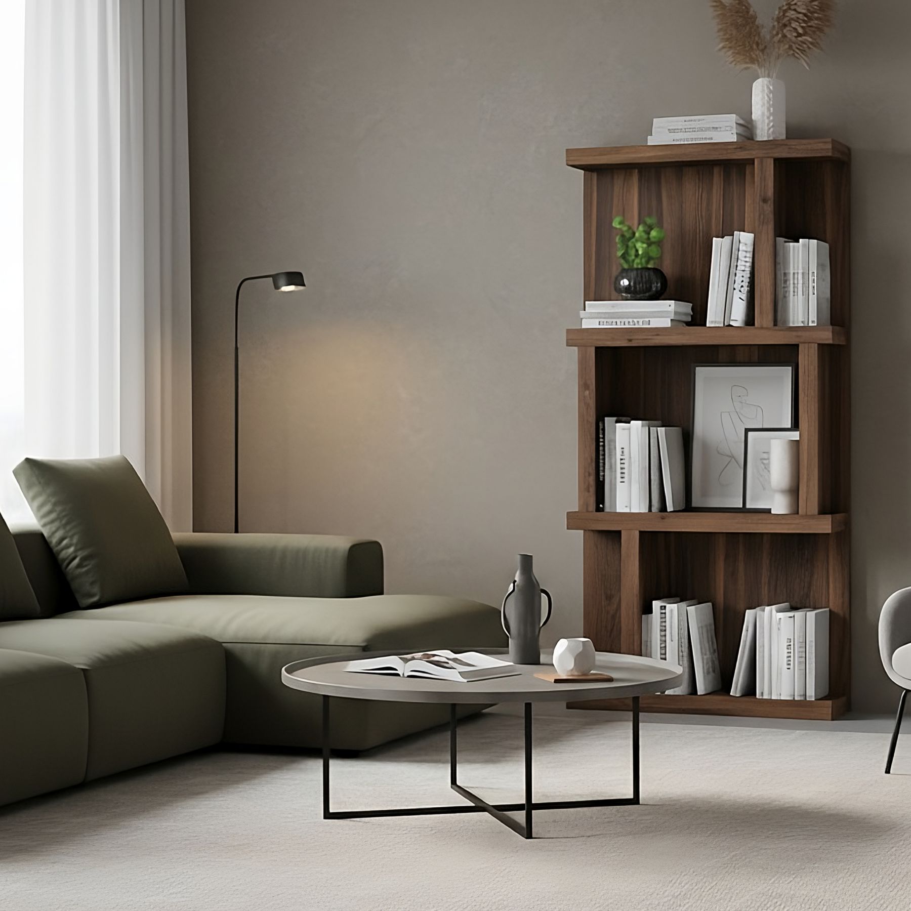 La bibliothèque Olivia en noyer combine élégance et praticité. Grâce à sa faible profondeur (26 cm), elle s’intègre aisément dans les espaces étroits tout en offrant une capacité de rangement généreuse. Les niches de hauteurs différentes permettent de structurer vos livres, vinyles ou objets décoratifs selon vos envies.