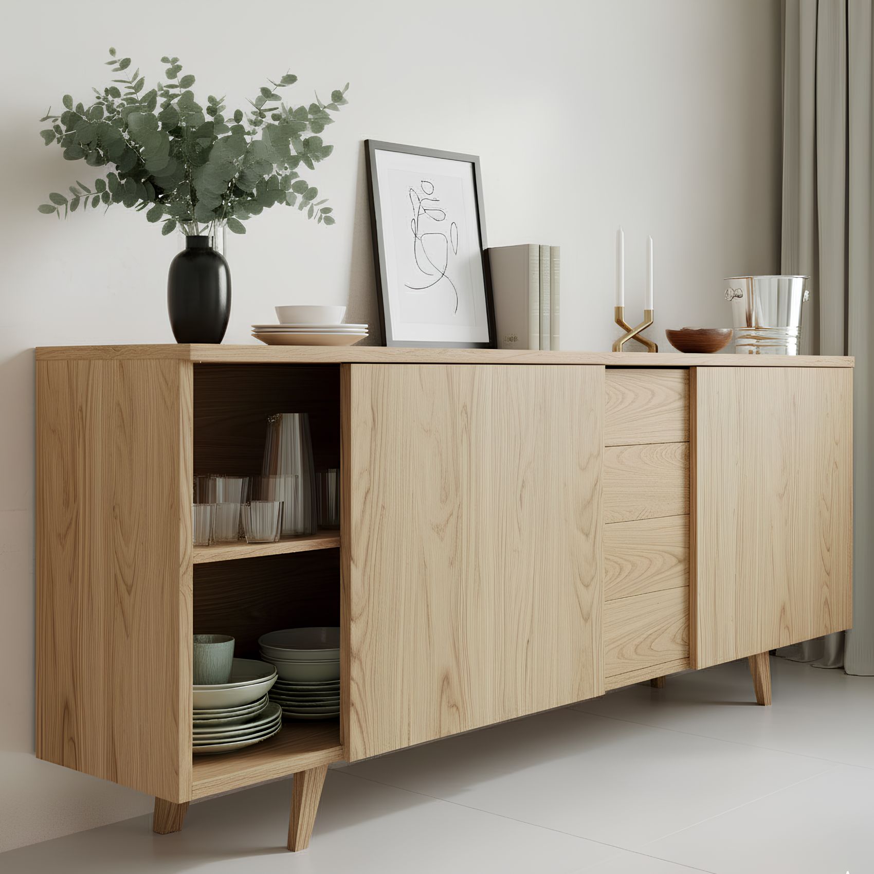 Outre leur côté pratique, les portes coulissantes et les tiroirs à ouverture par pression sont un atout esthétique pour votre buffet coulissant.