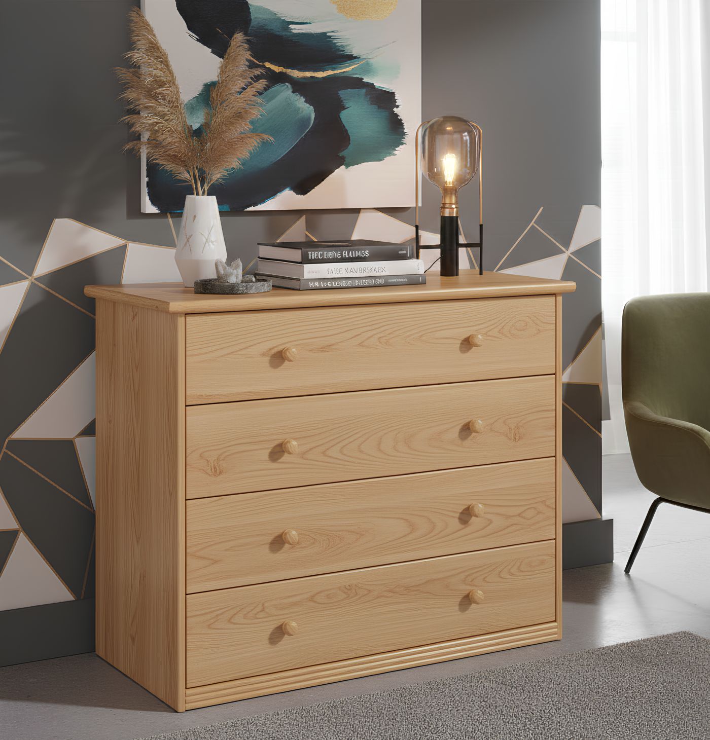 Avec ses 103 cm de large, cette commode offre quatre tiroirs d’une capacité confortable et réellement utilisable au quotidien.