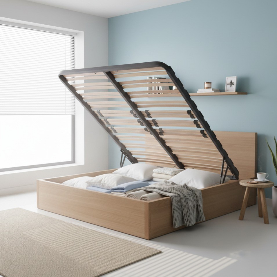 Grâce à ce lit avec coffre vous économisez de l’espace et avez un très large espace de rangement. Sous le sommier, relevable grâce à un vérin hydraulique, vous avez un grand espace de rangement d’environ 23 cm de hauteur.