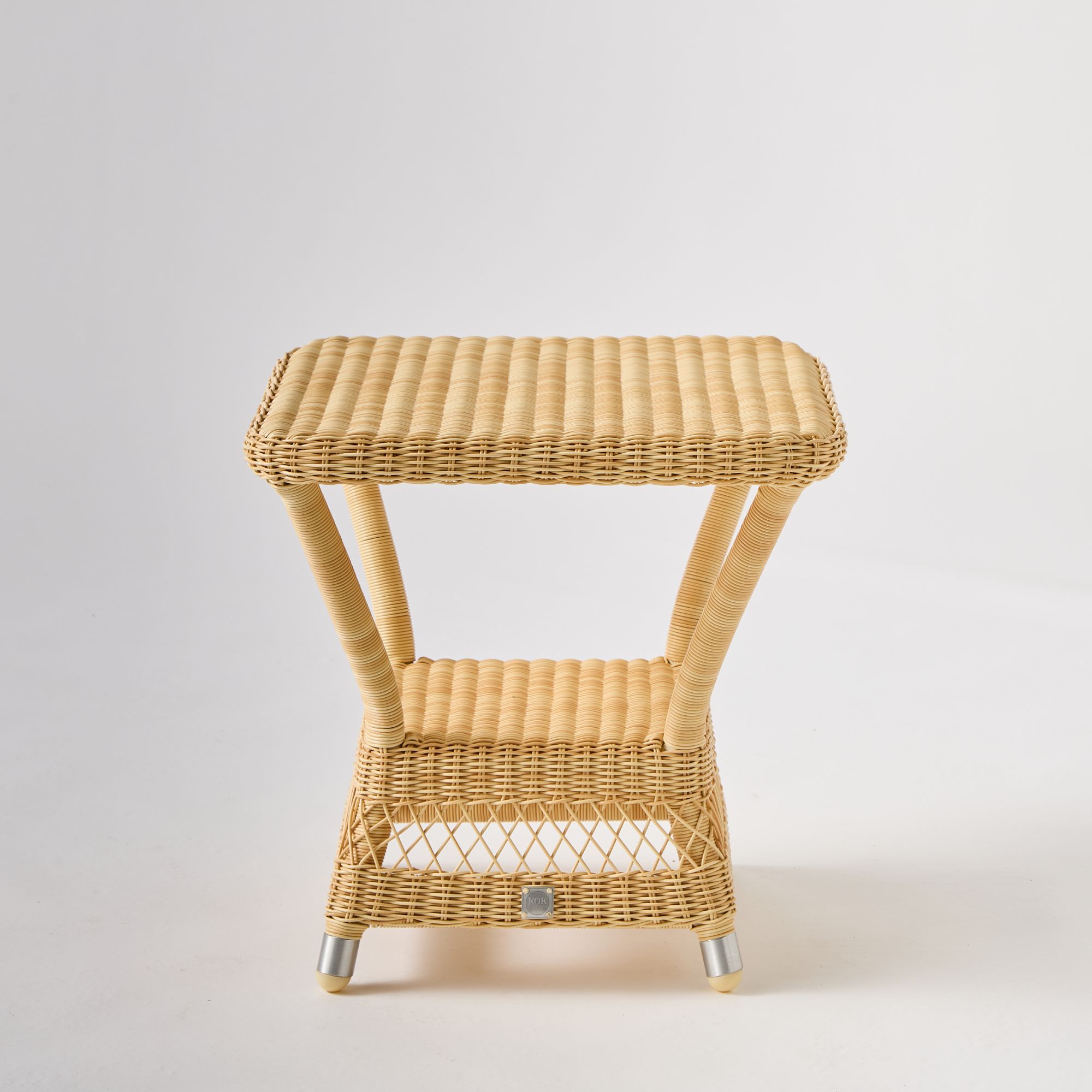 La table basse carrée Biarritz reprend l’esthétique du mobilier en rotin ancien : un tressage ajouré caractéristique, une silhouette légère et un coloris naturel qui évoque les salons de jardin élégants et les jardins d’hiver.