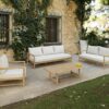 Salon de jardin en aluminium blanc et bois Composition: 1 canapé, 2 fauteuils, 1 table basse Couleur: blanc ou gris anthracite Délais de livraison: juillet 2022